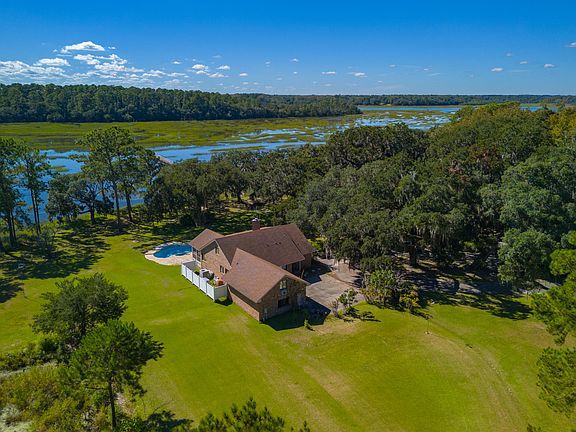 Prepare to fall in love with this extraordinary property that could easily serve as the enchanting backdrop for a novel or a Hollywood blockbuster. Nestled on a sprawling expanse of nearly 300 feet of pristine waterfront along the picturesque Coosaw River, this unique residence is located just ten miles from Beaufort and surrounded by more than 3 acres of stunning oaks adorned with graceful moss. Your very own private dock beckons you to enjoy days of fishing and boating, while quieter moments can be savored by the pool, relishing the breathtaking views. Evenings are a delight on the generously sized screened-in porch where you can watch the sun setting over the tranquil marsh bank.Tucked away from the hustle and bustle, this home is part of a cherished family property, accessible through a private gated entrance set back from Trask Parkway. The surrounding land remains in the family's ownership. Step inside to admire the exceptional craftsmanship of this custom-built design, boasting a timeless brick exterior. The original wood flooring guides you into a spacious family room, where endless water views take center stage, anchored by a cozy wood-burning fireplace and lofty vaulted ceilings. A convenient wet bar is ideal for entertaining, while the open kitchen invites large gatherings. Double glass French doors lead to a formal dining room, or opt for a more casual dining experience in the kitchen, which features an eat-at center island, ample cabinet and counter space, and room for multiple chefs. A cozy sunroom, currently used as an office, offers a peaceful spot to work while soaking in the captivating view. The owner's suite, conveniently located on the first floor, features wood flooring, a spacious walk-in closet, a generous vanity, and a separate water closet with a tub and shower. Upstairs, two sizable bedrooms provide some of the best views on the property. Above the garage, the fourth bedroom offers ample space for guests or the potential to become a fantastic media room or game room. The 5th bedroom is located on the main level. While you're just a stone's throw away from the beaches and shopping in Beaufort, it's hard to imagine a reason to leave a home as extraordinary as this.
