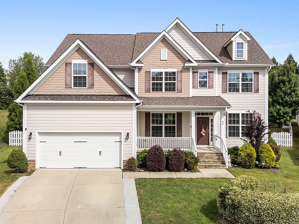 Elegant home in Flowers Plantation Gated Community with upscale finishes and exceptional outdoor living! Welcome to this beautifully crafted 5-bedroom, 4-bath home. From the charming covered front porch - perfect for rocking chairs and relaxing afternoons - you'll sense the thoughtful design and attention to detail that define this exceptional property. A grand 18-foot foyer greets you upon entry, setting the stage for an open, airy floor plan accented by hardwood floors on the main level, rich crown molding and detailed trim work throughout. The main level features a dedicated home office or flex space, a formal dining room with exquisite coffered ceilings, and a private en-suite guest bedroom with a spacious closet and attached full bath, ideal for guests or multi-generational living. The heart of the home is an open-concept living area, anchored by a luxury gas fireplace framed by custom built-ins and flowing into a chef's kitchen complete with a large granite island, stainless steel appliances, gas cooktop, and wraparound cabinetry for extensive storage. A breakfast nook between the kitchen and living space provides a cozy spot for casual meals. The kitchen is further enhanced by a spacious pantry and a separate butler's pantry for seamless entertaining. Open the sliding glass doors to a screened-in porch, leading to an open deck, ideal for grilling and entertaining. The fully fenced, triangle shaped backyard is beautifully landscaped and includes a shed for extra storage. Upstairs, you'll find four spacious bedrooms, including a secondary en-suite with its own closet and full bath, as well as a versatile rec room. The primary suite is a true sanctuary, featuring tray ceilings, an enormous closet, and a spa-inspired bathroom with elegant finishes. Additional features include a 2 car garage with entry into a mudroom featuring built-in shelving and bench, smart alarm system with alerts for all downstairs windows and doors, built-in wall system for discrete whole house pest control, laundry room with gas dryer, a dual HVAC system for enhanced climate control on both floors, and a crawl space for added storage and system access. Situated in the sought-after master-planned community of Flowers Plantation in Clayton, NC! Bring your own golf cart for traveling around the community and enjoy convenient access to expansive trails and a dog park. Located just minutes from the East Triangle YMCA, grocery stores, shopping, dining, healthcare, and more. Experience the perfect blend of elegant design, thoughtful upgrades, and a vibrant community - ready for you to move in and make it your own!