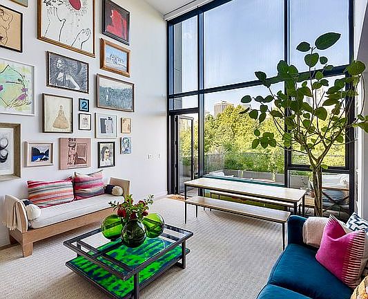 The open-concept great room with 18.5’ ceilings and full floor to ceiling windows framing the Manhattan skyline and New York Harbor is perfect for entertaining, complemented by a private terrace for seamless indoor-outdoor living. The chef’s kitchen is outfitted with top-of-the-line Gaggenau appliances, custom walnut millwork, and luxurious Calacatta Tucci marble. Additionally, the owner thoughtfully added extra storage beneath the stairwell, providing a smart solution for keeping kitchen and entertaining essentials organized.