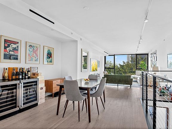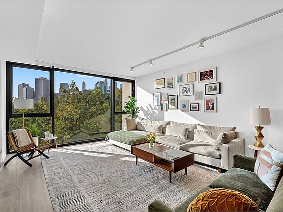 Spanning 1,525 square feet across two thoughtfully designed levels, this contemporary home offers a unique blend of modern elegance and comfort. The main level showcases the living, kitchen and dining areas, accentuated by floor-to-ceiling western-facing windows that flood the space with natural light and frame breathtaking, panoramic views of Lower Manhattan, the Brooklyn Bridge, East River, and the Statue of Liberty.