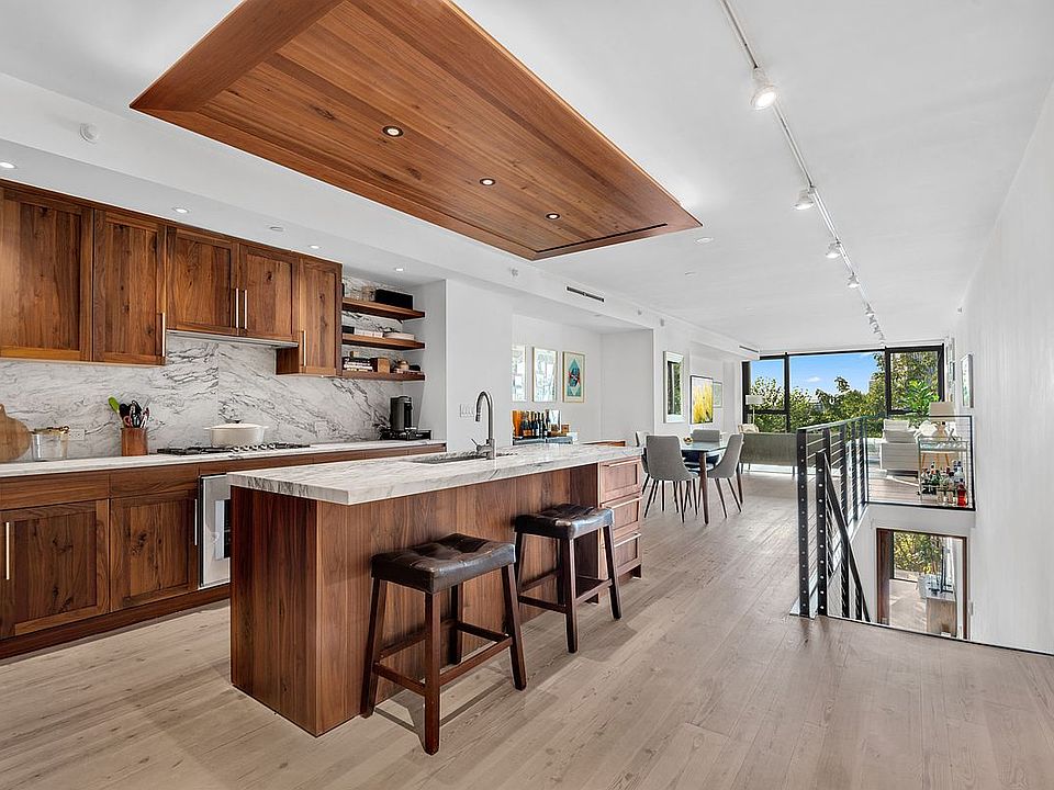 The entry foyer features a generous coat closet and a tastefully appointed marble powder room with Ruscello Fosso Picollo marble flooring, Waterworks fixtures, and Duravit fittings. The kitchen is a true showpiece, outfitted with Gaggenau appliances, custom American walnut Pedini cabinetry, Calacatta Tucci marble countertops, and a large island with an extra-large deep sink and an 18-bottle wine refrigerator. The dining area comfortably accommodates a full-size table and offers a flexible nook for a home office.