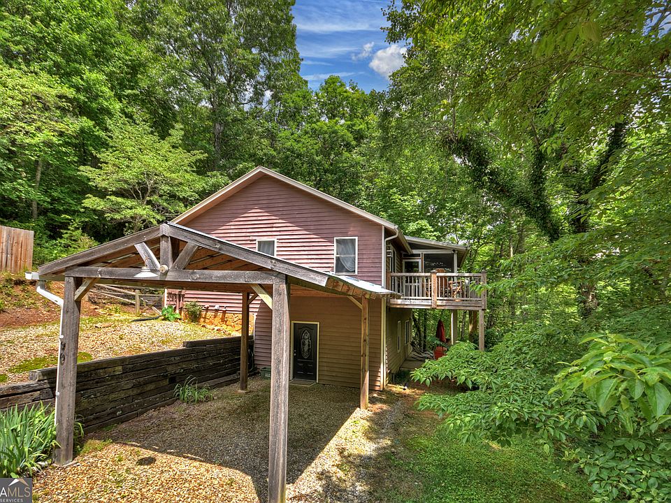Creekside Mountain Retreat - Enjoy privacy & seclusion tucked away in the peaceful North Georgia mountains conveniently located centrally between Blue Ridge & Blairsville, GA w/ easy no steep road access. This charming cottage features 3BR, 2.5 BA offering the perfect blend of comfort, privacy, & natural beauty. Enjoy serene cascading creek frontage right in your own backyard, complete with a creekside deck pavilion - ideal for relaxing, entertaining, or just soaking in the sights and sounds of nature. Large screened in porch and deck span across back of home overlooking the creek below. Primary BR on main level w/ open living, kitchen & dining room w/ half bath. Full finished basement features 2 additional BR's + flex 3rd BR/bunk room/bonus room w/ REC Rm/Den all opening onto the terrace level outdoor living space. The home features an open floor plan, a finished basement, and expansive porches - including a screened-in back porch - offering plenty of space for indoor-outdoor living. Whether you're cozying up inside or enjoying a cup of coffee outside, you'll feel right at home in this peaceful mountain setting. Interior finishes is the perfect blend of drywall & wood with rustic accents throughout. Floor to ceiling stone fireplace in great room w/ gas logs, vaulted ceilings & lots of windows adds to the warmth of the great room. Custom rustic style kitchen cabinetry w/ custom backsplash & stainless steel appliances make this an inviting place for those who know their way around the kitchen. Exterior features metal roof, attached covered carport w/ lots of additional parking on main & terrace level, large level/usable fenced in yard great for the kids or your furry friends, beautiful hardwoods & native flora & more. Conveniently located between Blue Ridge and Blairsville, you're just a short drive from shops, restaurants, hiking trails, & more. Nestled on this beautiful 1.15 beautiful wooded acres. May be purchased turn key fully furnished.