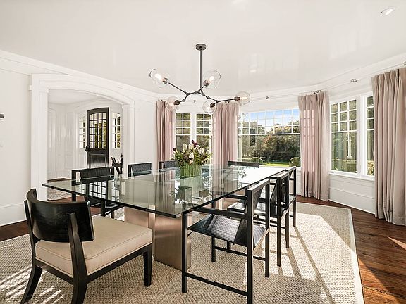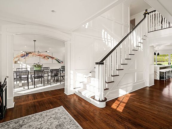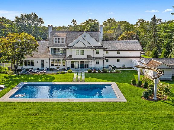 This elegant home is a stunning classic Hamptons colonial that's undergone a complete state-of-the-art renovation by renowned architect Robert Cardello. Sun drenched front-to-back, two-story entry is welcoming and allows an immediate glimpse at the beautiful open main floor spaces and property views. Special details throughout, including eye catching glass wall entrance to living room with fireplace and built-in curved window seats. The dining room echoes these curves and has walls of windows. The heart of the home is a spectacular open concept kitchen with sumptuous marble waterfall island, custom built-ins, top-of-the-line appliances and adjacent breakfast room and family room. Windows and glass everywhere make the interior light and airy, and invite you to enjoy the outdoor spaces, stone patios, pool, pergola and lush gardens. The 6500+ sq ft residence with 4 finished floors of luxurious living, including 4 spacious ensuite bedrooms, (5th bedroom/full bath potential on the 3rd floor) marble baths, media room, glass walled wine cellar, gym, cedar and copper roof, impressive front formal entry and car parking area leading to 4 car garage, and mature landscaping, is perfectly set on 2+ park like acres, in the most desirable Hemlock Hill neighborhood of New Canaan.