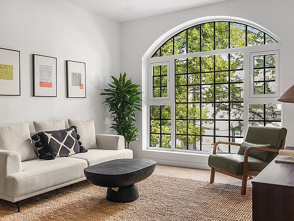 Residence 4A features an oversized arched window, a generously proportioned bedroom with an extra-large reach-in closet, and a private ensuite balcony. Set just one easy flight up, this home offers elevated living without the hassle of multiple walk-up levels.