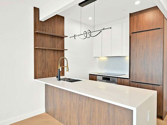 Behind its timeless red brick facade, interiors blend warmth and modern elegance with herringbone flooring, custom walnut cabinetry, polished quartz countertops, and serene travertine-tiled bathrooms. Residence 2B features oversized windows, a south-facing private balcony, and a generously sized bedroom with an extra-large reach-in closet.