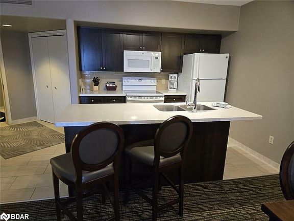Turnkey Resort-Style Living. This 1,400 sq. ft. 2-bedroom, 2-bathroom chalet on the 3rd level offers a unique opportunity for year-round living with premium amenities. Spacious double-unit design allows for flexible living, occupy the entire space or separate into two suites for rental income. Full kitchen and additional kitchenette in the second portion, providing convenience for guests or tenants. Resort-style amenities include indoor and outdoor pools, hot tubs, a fully equipped fitness center, and a clubhouse. Outdoor entertainment areas feature gas-fed fire pits, covered pavilions with BBQs and seating areas. Prime location with all Horseshoe has to offer, including skiing, snowmobiling, hiking, tree-top trekking, championship golf courses, an indoor golf zone, and Vetta Nordic spa all within minutes!