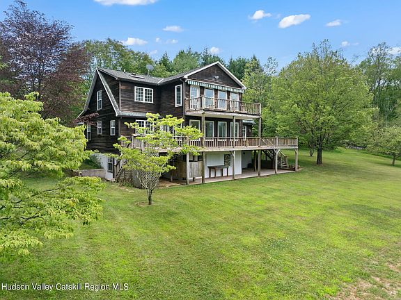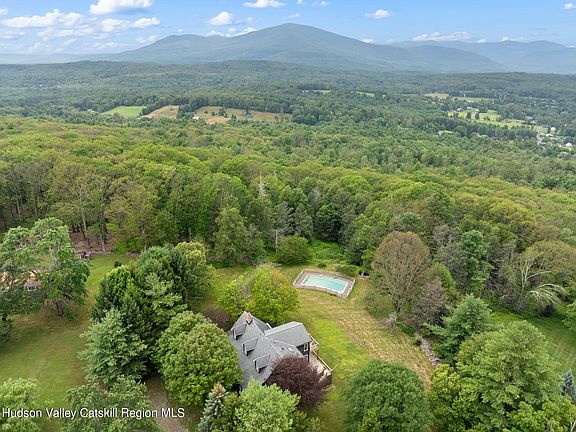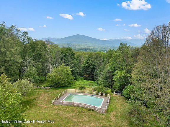 Welcome to 90 Highland Rd, Stone Ridge, NY. This exquisite 3-bedroom, 3-bathroom estate spans 2,926 square feet with an extra 1,461 square feet of finished basement space and sits on just under 4 acres. You'll be blown away by the sweeping mountain views from multiple rooms and both decks. Constructed with cedar siding the home features stunning dark wide plank hardwood floors throughout the home and antique terra cotta tile imported from France in the kitchen and dining room. Enjoy radiant subfloor heating in the kitchen, sunroom, and upstairs bathroom. The kitchen is equipped with custom walnut cabinets, marble countertops, a Viking Refrigerator, BlueStar range and a giant window that allows you to take in the view while cooking. The living room boasts cathedral ceilings, built-in bookshelves, and a 25-foot custom stone fireplace. Pella Architect series energy-efficient windows and doors enhance the home's comfort and efficiency. The property includes a custom mahogany front porch, apple, chestnut, pear, and peach trees in the backyard, an outdoor shower, and a custom curved rectangular gunite pool. The huge finished basement with a fireplace, additional full bathroom and bedroom, freshly installed carpet and walkout access to the yard adds to the home's appeal. This property is a rare find, situated between Olivebridge and Stone Ridge area and not to be missed.