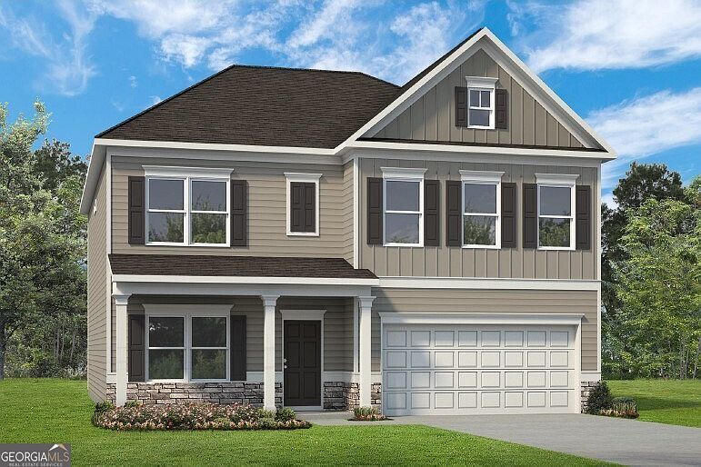 Move in Ready December! The James offered in Jones Ridge by Smith Douglas Homes. The James features a large dining room, a well appointed kitchen with a butler's pantry and a first floor guest room with a full bath that can also serve as a home office. The large family friendly mud room off the garage gives you the space you will want to drop your belongings at the door to keep your clutter to a minimum. Open family room with a gas fireplace invites indoor gatherings while the covered back back patio with an uncovered extension is the ideal place for outdoor entertaining. A well-appointed kitchen has Quartz counters, upgraded cabinetry, upgraded stainless appliances and a lovely tile backsplash. The open iron staircase leads to the amenities on the second floor that includes a convenient laundry room, an open loft and an expansive primary suite with a sitting room. Both floors have 9ft ceiling heights and additional windows create a light-filled and airy atmosphere. Seller incentive with the use of preferred lender. Photos representative of plan not of actual home.