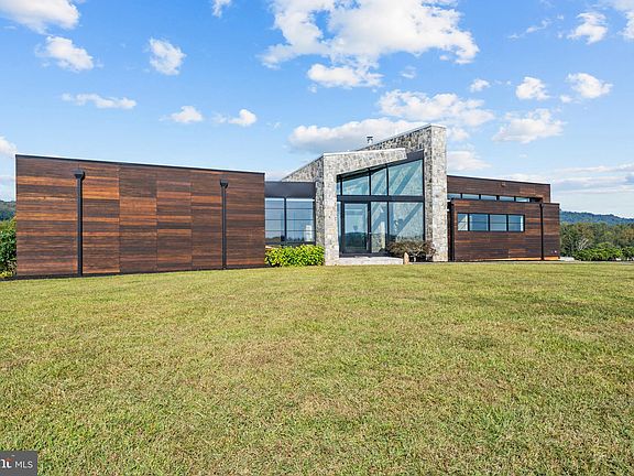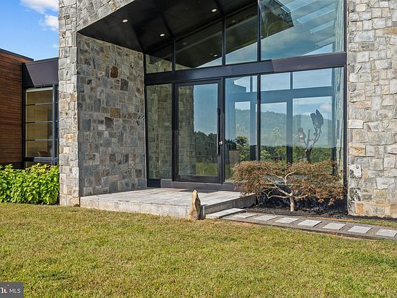 Amidst rolling hayfields and sweeping mountain views, House of Sky is a modern retreat designed for serenity and connection to nature. The striking stone-and-wood exterior opens to expansive western windows framing the Blue Ridge horizon. Designed by Lavinia Pasquina Fici and John Nahra, the home blends artistry with function in an exceptional 53-acre setting with hayfields, vineyard, and orchard. Inside, the open kitchen/dining/living space soars with 15’ ceilings, bleached white oak floors, and walls of glass. Custom Cabico cabinetry, Brazilian granite, Caesarstone, and top appliances—Wolf, Sub-Zero, Bosch, and Grohe—make the kitchen a chef’s dream. Sliding doors lead to terraces for outdoor dining and entertaining. The primary suite features floor-to-ceiling windows, a luxurious travertine bath with soaking tub, radiant heat, and spacious closet. A second bedroom with built-in bunks, private library, and lower-level wine cellar complete the home. Additional highlights include a garage, well-equipped laundry, and radiant floors. Located just 5 minutes from Washington, VA, and 10 minutes from Sperryville, this extraordinary property offers modern design, peaceful solitude, and proximity to fine dining, boutique shops, and the best of Rappahannock living.