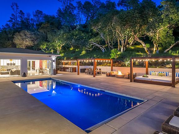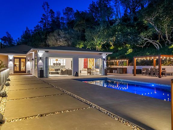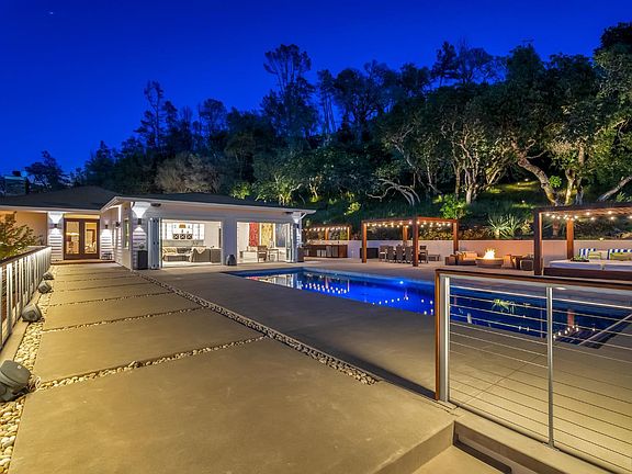 Welcome to 90 Longhorn Ridge, nestled within a prestigious gated equestrian community in the scenic eastern foothills of Napa Valley. This exclusive estate boasts miles of private riding and hiking trails, offering breathtaking sunsets and views of Lake Berryessa, the surrounding rolling hills, vineyards, and natural beauty. Designed for entertaining, this stunning home features an open floor plan and a state-of-the-art kitchen equipped with commercial appliances. The luxurious primary suite, dining room, great room, and family room all open to an incredible outdoor space. Enjoy the beautiful covered wraparound porch with a fireplace and views of Lake Berryessa. The outdoor area also includes a bocce ball court, hot tub, and pool area, complemented by a large outdoor kitchen with a BBQ grill, sink, beer taps, and a covered dining area, lounge area, fire pit, and chaise lounge area. The three-car garage offers ample storage with wall-mounted cabinets and a workshop space. An ADU just steps away is ideal for accommodating in-laws, visiting guests, or family members. Don't miss this rare opportunity to experience Napa Valley living in a serene, exclusive neighborhood, while remaining close to world-class wineries, dining, shopping, and the picturesque Lake Berryessa.