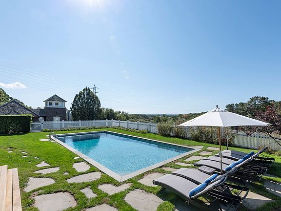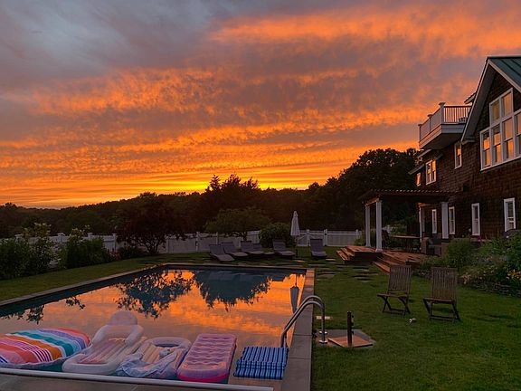 Perched up high on 7.6 acres of rolling hills through a private gated entrance is this special property. The tri-level main house has three bedrooms plus a bonus room with balcony and trundle bed. The first level includes a king primary suite and recreation/den with ping-pong and media leads out to sparkling pool with lounging. A large fire pit area with seating designed for large nightly gatherings adds to the unique sprawling grounds and entertainment. The second floor main level flows comfortably with an open designed kitchen, living and dining room areas with a fireplace and media leading to an outside covered balcony . Highlights of this man level are the spectacular views to treasure the nightly sunsets. Also on this main level, are two queen bedrooms with a shared full bath plus a separate powder room . Up a spiral staircase is an additional bonus room with a private balcony. On the grounds, close to main house is a sizable guest house with a king bed, full bathroom and loft space offering privacy for guests. The house was built to take advantage of sunsets and spectacular views of Mecox Bay and the ocean. Guests love this house for its serene artistic flair. Centralized and convenient location and