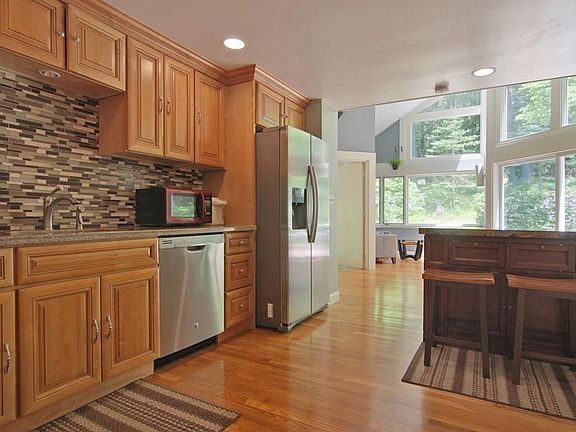 This sun-drenched 3,000 square foot four bedroom contemporary home is ideally sited on 1.4 acres near town center. The remodeled kitchen with granite counter-tops and new stainless steel appliances looks out a wall of windows onto the picturesque and private landscape. The spacious fire-placed living room and dining room with gleaming hardwood floors feature sliding doors to the large rear deck. The main floor features three large bedrooms including a master with en-suite bath. The lower level is ideal for extended family with a separate entrance, private bath and bedroom, as well as a separate family room. Recent upgrades to the home include a new roof, new double-hung windows, exterior and interior painting, and new water heater. The property is further enhanced with perennial gardens and a large lawn. This well maintained home offers great value with the potential for additional improvements.