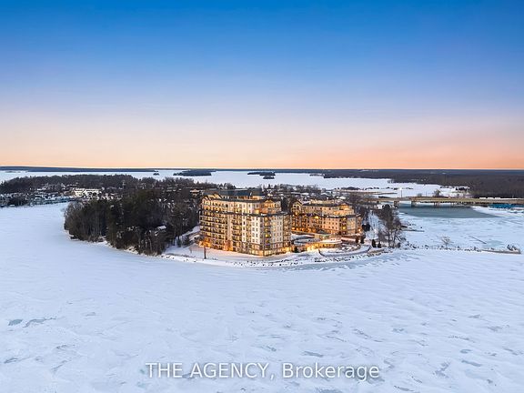 Perched at the north end of Lake Simcoe and just minutes from downtown Orillia and Casino Rama, this luxurious 2-bedroom, 2-bath waterfront condo offers over 1,200 sq. ft. of maintenance-free living. Featuring soaring 10-ft ceilings, wide-plank flooring, and a custom chef's kitchen with quartz countertops, upgraded stainless steel appliances, and oversized island with breakfast bar. The sun-filled great room includes a modern linear electric fireplace and sliding doors to a private lakefront balcony with gas BBQ hookup-perfect for enjoying stunning sunrises and sunsets. The spacious primary suite accommodates a king-size bed and offers walk-through closets and a spa-inspired 5-piece ensuite. A versatile second bedroom with French doors is ideal as a guest room, den, or office, located next to a stylish 3-piece bath. Enjoy resort-style amenities including fitness centre, sauna, pool, hot tub, theatre, party room, outdoor terraces, guest suite, and more. Boat slips available for rent right outside your door. Includes 2 parking spaces and storage locker. Four-season lakeside living at its finest.