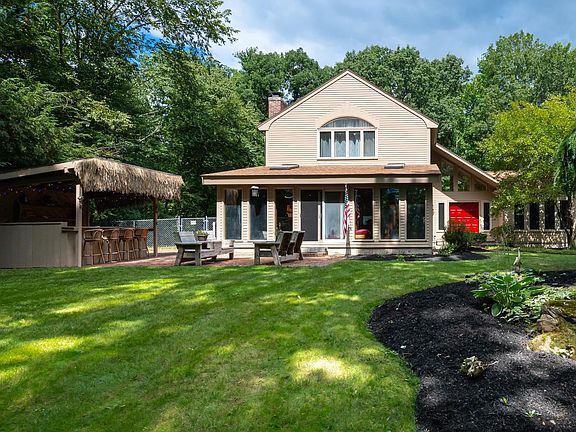 Experience the charm of this Custom Contemporary home set on 4.18 peaceful and private acres. The open-concept design features soaring two-story vaulted and cathedral ceilings, allowing natural light to flood the living spaces. It has a desirable floor plan that seamlessly connects various rooms, making it perfect for entertaining. Lovely updated kitchen with granite countertops, a center island, double ovens, a convenient pantry, and ample cabinet and storage space. Comfortable family room with a fireplace and built-in cabinets, provides access to the four-season sunroom with brick flooring, a sauna, a hot tub, and a cozy seating area. Step out to the lush backyard, which includes a cabana and tiki hut. The spacious dining room is ideal for large gatherings and opens to a two-story foyer with an elegant window-lined staircase. Another special feature on the first level is the living/theater room with a fireplace. The second floor has 3 bedrooms, 2 bathrooms, and a beautiful loft area. The basement provides plenty of room for hobbies and activities. The property also includes an oversized two-car garage with storage above and a shed with electricity.
