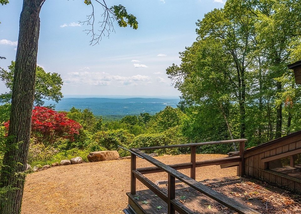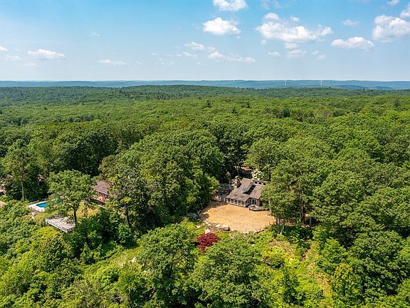 EXPECT TO BE IMPRESSED with this single-owner and one-of-a-kind contemporary home built in the 1970s that offers breathtaking, elevated views and is adjacent to 90+ acres of conservation land w/ walking trails and pond. Soaring vaulted ceilings and a wall of sliding doors enhance the great room which is anchored by a conversation pit and massive stone fireplace w/ wood-stove. The expansive kitchen, boasting abundant cabinetry and countertop space, flows into the dining area with sliding doors that lead to the deck. With 4 spacious bedrooms, 2.5 baths, separate office, den, and sunroom that frames the exceptional year-round vista - there is plenty of room for everyone. A 5-bay Morton building makes for an ideal workshop, automotive storage, various hobbies - even 2+ indoor pickleball courts. This secluded retreat exudes mid-century charm—though it does need a little polishing and some repairs, it has a brand new septic system and is the perfect opportunity for your own personal touches!