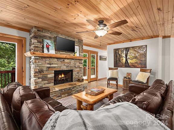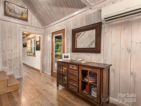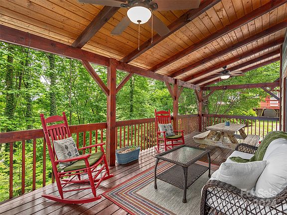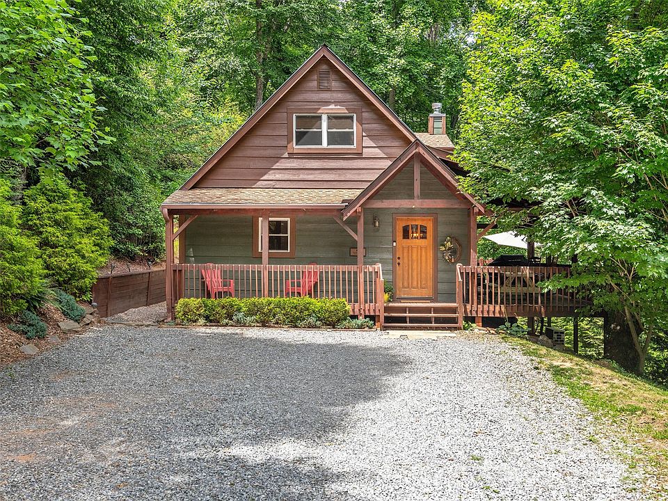 Tucked away on a serene spot off County Rd by Lake Junaluska lies an enchanting treehouse-style home, a haven with 3BR/2.5 BA. Revel in outdoor living with its charming front porch & expansive covered side porches. Meticulously designed, every detail reflects perfection, whether as a retreat or full-time abode. Step inside to a rustic yet elegant dining area, bathed in natural light, adjoining a granite-topped kitchen with stainless steel appliances & striking red cabinetry. A main floor guest BR offers convenience, alongside a spacious locker-style laundry room. The main level also features a generously sized living room, boasting wood ceilings, hardwood floors, and a cozy stone fireplace framed by windows. Ascend to discover the primary suite, complete with a luxuriously appointed double vanity bath & sizable walk-in closet. Another guest BR, BA, & a versatile loft area, currently serving as a 4th BR, grace the second level. Experience the magic of this once-in-a-lifetime creation.