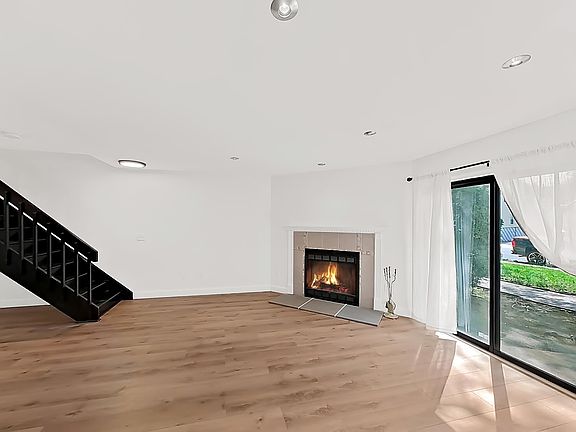 Tastefully renovated ground-floor, two-level condominium located at 90 Ralph St Unit #3 in a quiet area of Belleville. The entryway includes a floor-to-ceiling shoe closet and an adjacent coat closet. The main level offers a living room with a wood-burning fireplace, a dining area, a kitchen featuring solid wood cabinetry, quartz countertops, stainless steel appliances, and two pantry closets. Double sliding doors provide access to a private patio.