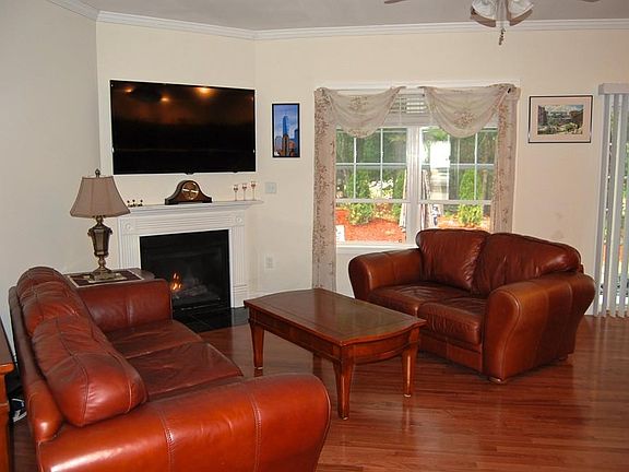 One year young townhouse in a great community has it all with everything included: front farmers porch, open concept 1st floor w/hardwood flooring & crown molding, 9'ceilings, gas fireplace in living room & ceiling fan, wall mounted 55" TV, sliders to private patio over looking wooded landscaped area, one car garage, granite kitchen countertops and island, with stainless steel appliances including refrigerator, recessed lights and bonus wine rack over sink. Granite countertops in two full baths & pedestal sink in half bathroom, king sized master bedroom w/large full private bathroom, king sized 2nd bedroom, 2nd floor laundry area w/ceramic tile flooring & shelving including Samsung VRT SmartCare electric washer and gas dryer and all window treatments. Lots of storage space including an unfinished basement and attic w/pull down stairs. Energy efficient & low $250.00 condo fee! Located minutes from route 3 and 495/128, public transportation, shopping, entertainment, etc!