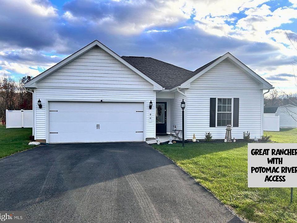 ONE LEVEL LIVING WITH RIVER ACCESS!!! Located in the distinguished Brookfield subdivision, come enjoy this this 3 bedroom and 2 bath ranch home in quiet part of the neighborhood. The home offers a blend of open and traditional floor plans with living room/kitchen/dining open, and traditional layout for the bedrooms - but with a split bedroom layout for additional privacy for the primary bedroom. The country kitchen features gorgeous white cabinets, that compliment the granite countertops, and stainless steel appliances. There's a convenient pantry and additional appliance cabinet that will convey to purchaser. The two car attached garage provides shelter for your vehicles, or could be an incredible workshop. Seller is leaving two heavy duty shelving units to assist with your storage needs. Outside, you will find a cute 10 x 10 concrete patio, surrounded by a newer Trex deck for outdoor entertaining. The backyard has been completely fenced with a vinyl 6' privacy fence. Enjoy the community’s many amenities, including Potomac River access, a ballfield, play area, dog park, pavilions, and walking trails. Conveniently located just minutes from the Maryland line—ideal for commuters. Built in 2022, this home is practically brand new! Please schedule your private tour today.