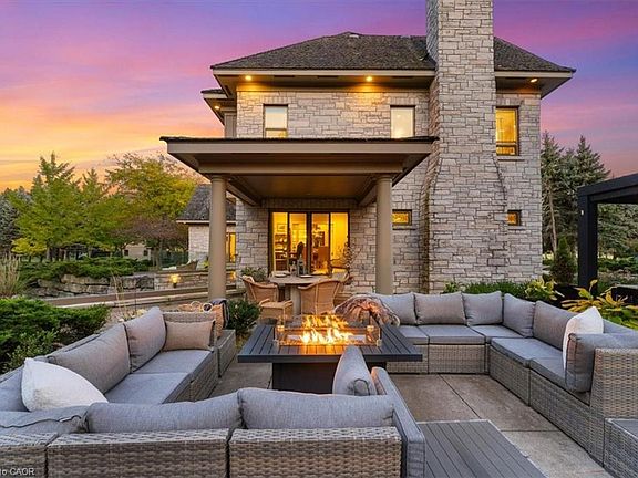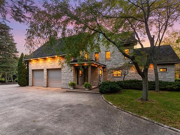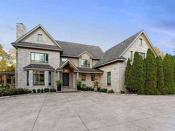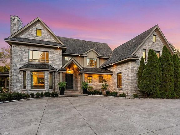 Perched atop the Niagara Escarpment, this gated European chateau-inspired estate offers a breathtaking lifestyle on over 4 acres. Designed with timeless architecture and built with solid limestone exterior, it boasts panoramic views of Lake Ontario, the Toronto skyline, Beamer Falls, and the valley river below. Step inside nearly 7,492 sq ft of refined living space featuring a grand foyer, formal living & dining room, a private office, & soaring 10-12 ft ceilings. The gourmet kitchen includes high-end appliances, a butler's pantry, & a sun-filled dinette that flows into the cozy family room. Upstairs, the serene primary suite offers a spa-like ensuite & walk-in closets. Two additional bedrooms share a beautifully appointed bath, while a private guest or in-law suite with 3-pc ensuite is situated above the garage with its own separate exterior entrance. The entertainer's lower level includes a custom billiards room with wet bar, home theatre, wine cellar, & a luxurious spa bathroom with sauna, steam shower, & gym access. Outdoors, enjoy alfresco living with a full kitchen, fireplace, & expansive patios-framing some of Southern Ontario's most stunning views. A year-round, two-storey 300 sq ft bunkhouse/playhouse with radiant heat & A/C offers a dream retreat for kids or studio space. Set in Niagara's wine country, just minutes from Grimsby's charming town center, this rare estate offers seclusion, sophistication, and convenience-near world-class wineries, Lake Erie beaches, and only 45 mins to Buffalo Airport or 1 hour to Toronto Airport. An unmatched opportunity to own a landmark property where lifestyle, location, and legacy meet-all at a value far below current replacement cost. Luxury Certified.