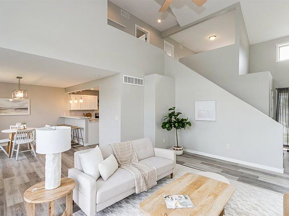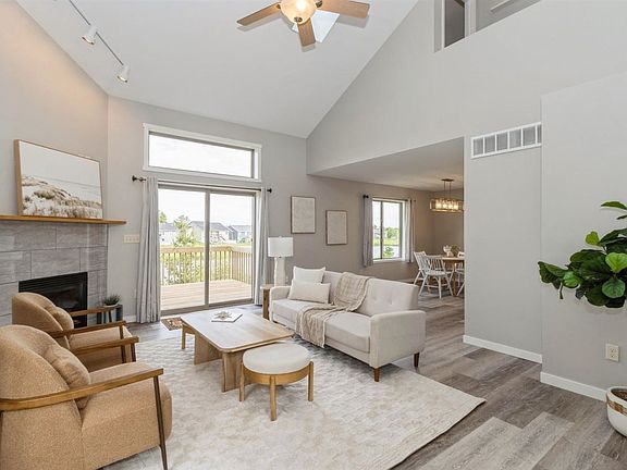 Charming and spacious, move-in ready 2-story zero lot in a great North Liberty location! This light-filled home offers an inviting open layout with LVP flooring throughout, soaring 2-story ceilings with skylights in the living room, and a cozy corner gas fireplace. Step out from the living room to a deck with serene pond views, perfect for relaxing or entertaining. The eat-in kitchen features white cabinets, stainless steel appliances, range hood, & a breakfast bar for casual dining. A convenient half bath completes the main level. Upstairs features a versatile loft, great for a home office, playroom, or fitness space. The primary suite includes vaulted ceilings, ensuite bath, and walk-in closet. Second bedroom up along with a full hall bathroom. The walkout lower level adds even more living space with a family room, 3rd bedroom, updated bathroom, laundry room, and great storage. Walk out to the concrete patio and enjoy the fully fenced yard. Close to parks, trails, schools, UIHC North Liberty Campus, and all that North Liberty has to offer!