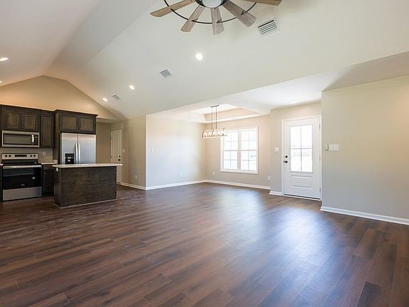 New Construction with split floor plan under 225k. Kitchen has custom cabinets, window above sink, a separate pantry, stove/oven combo, microwave, fridge, dishwasher, and kitchen island. Lots of light in this area. The living room has a vaulted ceiling, and the primary bedroom has a trey ceiling. The main bath has double vanities and custom cabinets. Luxury Vinyl Plank(LVP)flooring in living, kitchen, dining, laundry and hall bath. Carpet in bedrooms and tile in master bath. Two car garage with remotes and keypad entry. Contact agent for more New Construction possibilities! Estimated completion is End of Feb. 2024. Listing agent is part owner. Taxes on lot only. Pictures are of a previously built home of the same floor plan.