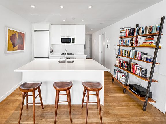 Enter the apartment thru a gracious foyer, with two large closets, opening up into the oversized living/dining room with double north west exposures offering a wall of windows with both light and views coming from the tree-lined plaza below. The open kitchen with white lacquered cabinets and well-proportioned island boasts modern appliances and dishwasher. Both bedrooms are roomy and can easily fit a king sized bed with an en-suite bath and 2 closets for the primary. Currently configured with two queen beds.