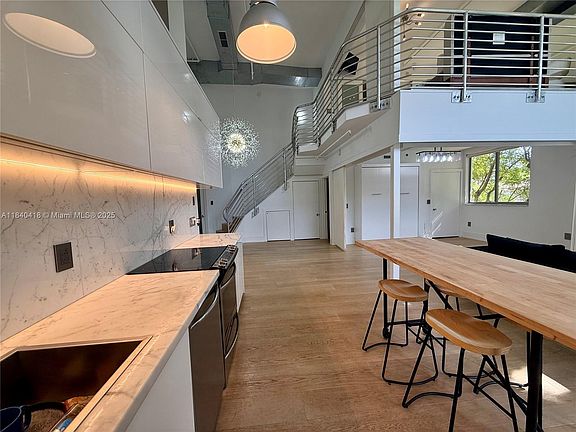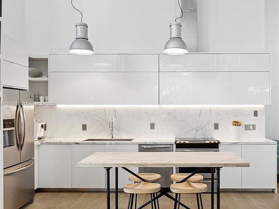 Experience true loft living in this stunning South of Fifth residence, boasting soaring 20-foot double-height ceilings and an open NYC-style layout. Sunlight floods the space through floor-to-ceiling windows, highlighting the beautiful light wood floors.
