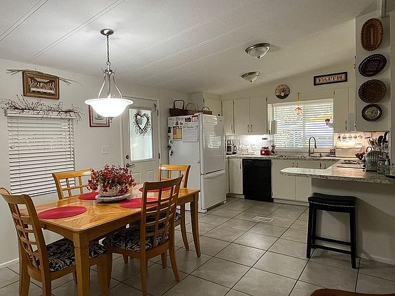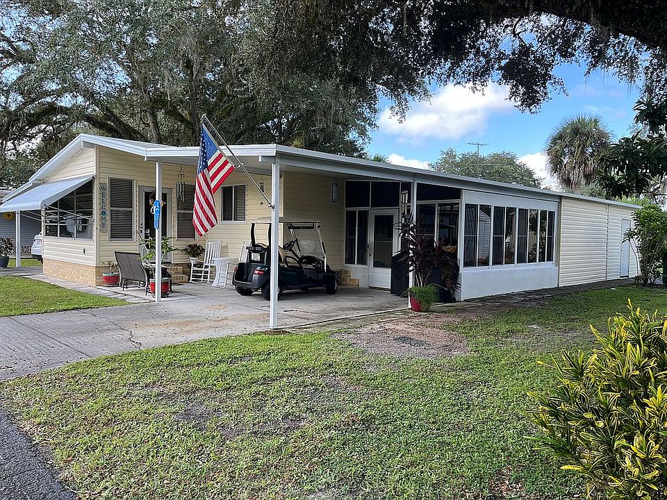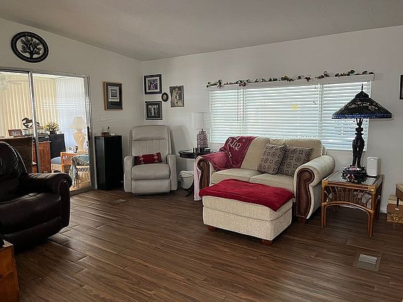 This charming, 36 x 24 Palm Harbor manufactured home offers plenty of parking and storage for your needs. The 2 bedroom, 2 bathroom home comes with appliances and is partially furnished. Living room and eat in kitchen are open with cathedral ceilings. The sunroom and covered patio are east facing and are a wonderful place for your morning coffee.
