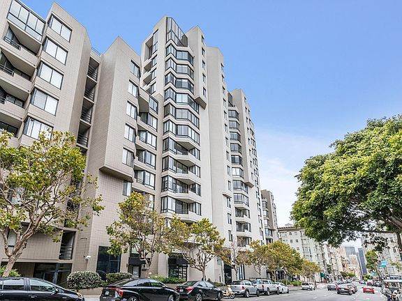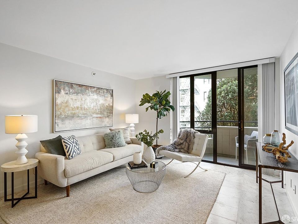 Located in the ultimate urban neighborhood, Unit 402 is a bright & beautifully updated 1-bedroom, 1-full bath open floor plan condominium with a private balcony accessed off the living room and textured views from all rooms overlooking the quiet courtyard. This home is updated with care and consideration for the details including a beautifully modernized kitchen with quartz counters, under cabinet LED lighting and stainless steel appliances. The bathroom is bright & updated with marble top vanity sink and designer LED lighting. The marble tile flooring throughout the unit creates a classic contemporary environment. The floor to ceiling windows in the living room bring in plenty of natural light. There is ample closet space throughout. Situated in a full service elevator building, amenities include 1-car assigned parking, common amenity EV charging station, 24/7 lobby attendant, fitness center, landscaped plaza with outdoor swimming pool (seasonal), large and updated common area laundry room (pay by cc), onsite professional property management, broadband, internet, heat & more! Steps to FiDi, Union Square, Huntington Park, shopping & dining.