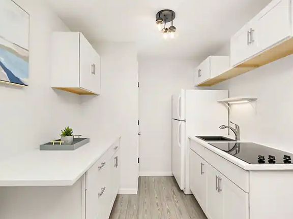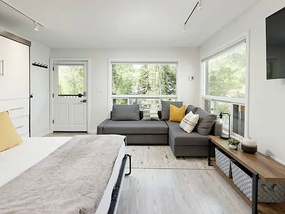 Unit is a "turn key" fully furnished studio with a queen murphy bed as well as a modern pull out couch for guests, tasteful decorations, new cabinets, new fixtures, new paint fully equipped kitchen, and everything you may need. The unit is designed for efficiency with a clever layout of space.