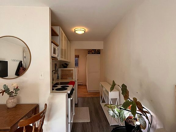 This ground floor studio has new flooring, a remodeled kitchen with new cabinets, quartz countertops, and microwave, full bath with tub, north/south facing windows with courtyard/tree views and two closets. Great morning light.