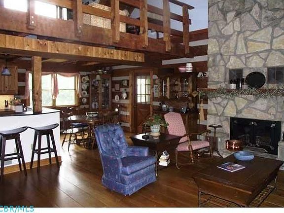 Amazing hand hewn log home situated on 5 tree lined acres with terrific stocked pond and 30 x 40 outbuilding. Two story great room with stone fireplace open to kitchen and dining areas. Loft overlooking great room, second floor master has vaulted ceilings and loads of closet space with custom shelving. Lower level has family room with hook up for a wood stove. 4th bedroom has custom wall shelving. Awesome paver patio overlooking park like setting with view to pond.