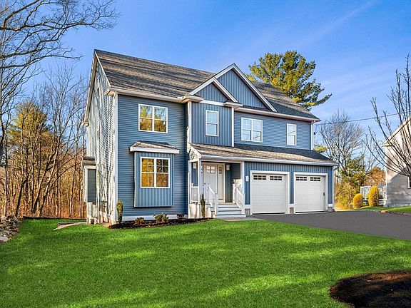 New construction 4 bedroom, 2.5 bath HERS energy-efficient colonial crafted by one of Tewksbury’s most sought-after builders. Offering 2,600 sqft of thoughtfully designed living space, the exterior shines with striking board-and-batten accents. Inside, the bright open floor plan centers around a beautiful kitchen with white cabinetry, island, quartz countertops, stainless steel appliances, hood vent, built-in microwave, and recessed lighting. The kitchen flows into a warm, inviting living room featuring stunning floor-to-ceiling custom woodwork framing the gas fireplace, plus a slider to the maintenance-free deck overlooking your private acre lot abutting woods. The elegant dining room boasts shadowboxing and crown molding. Upstairs are 4 spacious bedrooms. The primary suite impresses with hardwood floors, 2 walk-ins, and a luxurious ensuite with tiled shower, niche, quartz double vanity, and linen closet. Walk-up attic and walk-out basement offer future potential. 2nd floor laundry!