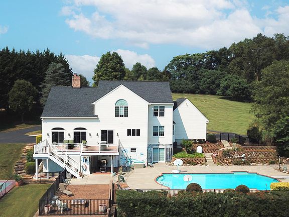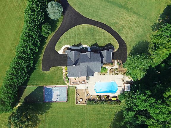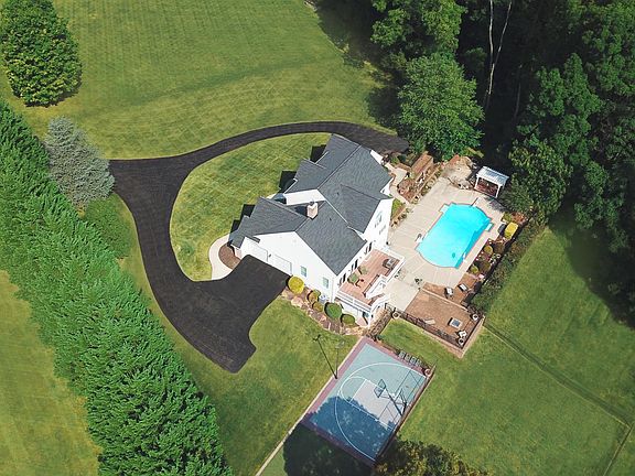 BEST& FINAL OFFER MUST BE IN BY SUNDAY NOV 5 @5PM! Take the shared driveway which leads to this brick front colonial featuring approximately 5,100 fin. SF with 4 bedrooms, 3.5 baths, and 3 finished levels with 9ft ceilings, and 3 garages off a private semi-circle asphalt driveway. Situated on a 2.56 acre lot with a heated inground pool with extensive hardscaping and sports court with overhead lighting, backing to trees. Step inside through the front door to the foyer entry with atrium window and chandelier, crown molding, wainscotting and hardwood floors to the living room, dining room and leading to the kitchen with tile floors. French doors to the study complete with custom built-in millwork style cubbies. Kitchen with granite counters, maple cabinets, panelled Sub-Zero refrigerator, stainless steel appliances, and large glass slider to the extensive rear deck which allows you to take in scenic views. Find a second refrigerator off the kitchen in the mudroom with built-ins. Step down to the family room with floor to ceiling brick wood burning fireplace with beadboard accent wall, luxury plank flooring, plantation shutters and two glass sliders to the deck overlooking the rear yard with heated in-ground pool with patio surround, pergola, and firepit with pavers. Hardwood floors lead up the front staircase to the spacious primary suite with huge walk-in closet featuring laundry room, built-in shelves and private bathroom with maple cabinets, double-sink vanity, jetted garden tub with decorative tile surround, walk-in shower with dual shower heads and bench. Three more spacious bedrooms and full hall bath complete the upper level. Finished walkout lower-level with wet bar featuring ample cabinet space and dishwasher, full bath with pool access, second laundry room, and slider to the patio with pool and under deck storage, and walk-up to single car garage. Impressive indoor and outdoor spaces designed for all your entertaining needs!