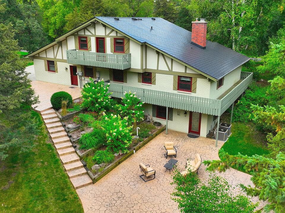 Updated Chalet-style home in wooded setting. Abundance of natural light for 2 stamped concrete patios, an in-ground pool & perennials. Spacious floor plan features LR w/vaulted ceilings & 2-way GFP to cozy FR. KIT offers quality hickory cabinets, pull-out pantry & spice racks, quartz counters & Viking induction stove. DR perfect for guests. Main floor also offers den/office & 1st floor laundry. Upstairs are 4 large BRs, including primary suite w/double closets & private balcony. Primary BA has spacious walk-in shower, Kohler toilet, Grohe shower head & custom vanity. 4th BR, currently office, offers view overlooking LR. Walkout LL provides space for recreation. Home is a smart investment with solar panels, metal roof & Hardie board siding providing significant energy cost savings.