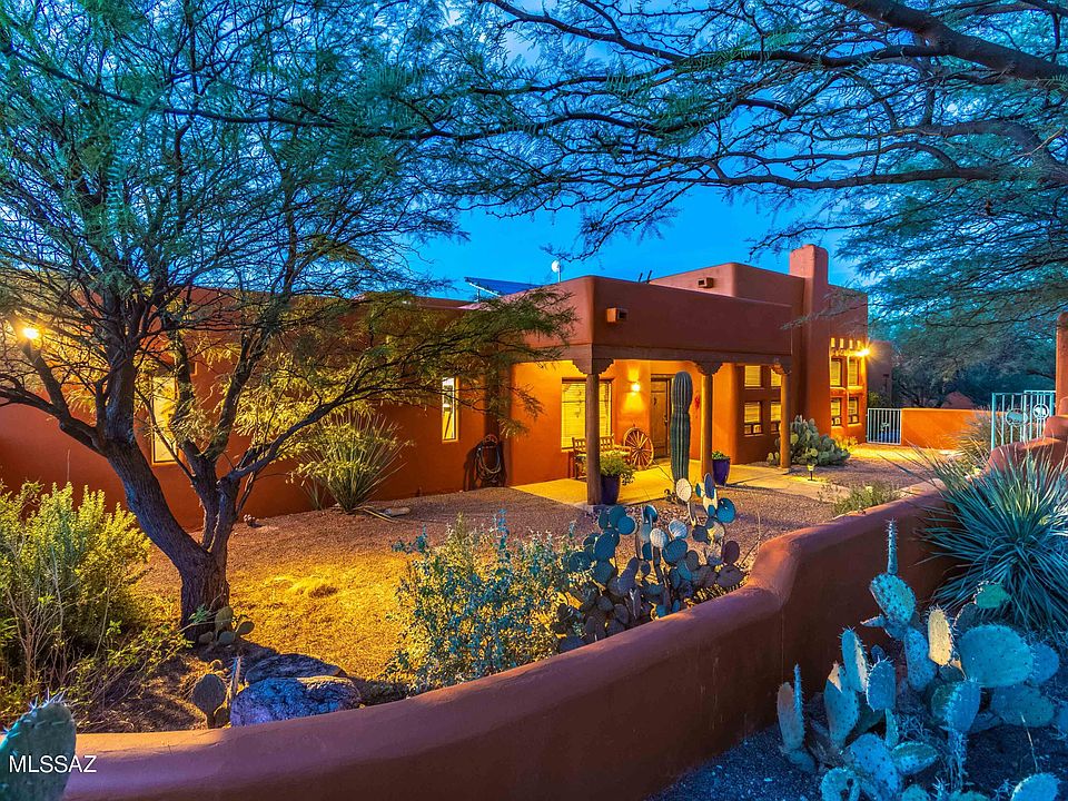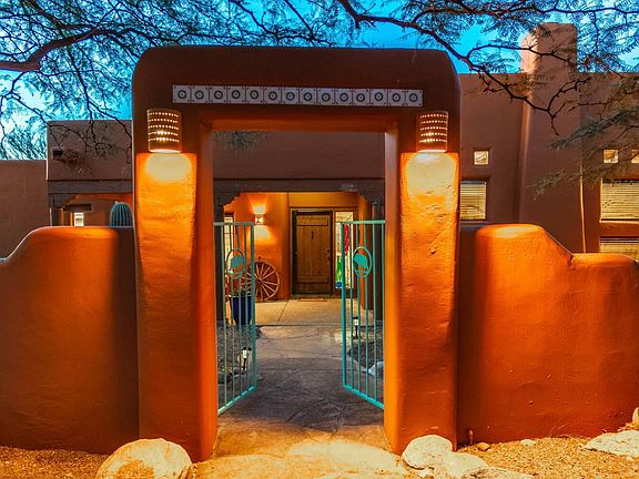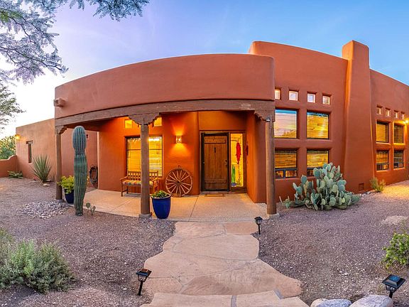 Spectacular views of the Catalinas and Rincon's this beautiful estate offers. This Beautiful Santa Fe style home is just over 2600 sqft with 4 spacious bedrooms and 2 bathrooms. Great room features ambient lighting to accent the walls/ niches and also has a dual fireplace. Granite counters and hardwood cabinets in the kitchen with a breakfast nook but also a large separate formal dining area. Master is very large with a gas fireplace and private access to back patio. Flooring was updated throughout, you won't find any carpet in this home. Step out back to enjoy the extended covered patio or take a dip to cool off during the summer. Wanna swim all year round? You can! Pool is also connected to solar heater. Property also features an additional detached/ RV garage/ shop, with abundent