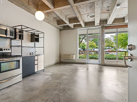 True live/work studio with its own exterior entrance and patio space. Situated in the creative community of Milepost 5 Lofts, the unit is a gem of industrial design with concrete floors, good light from a wall of windows (with custom privacy shades) and high ceilings. Perfect for a studio space, running a small business, or just living in it. The west-facing patio space fronts the community garden, full of fresh vegetables and herbs, an ideal spot to relax! Many artists and creative people in the building. Condo comes with a dedicated storage space in the basement, plus secure bike parking and access to the community rooftop deck. Milepost 5 Lofts sits not far from the up and coming business district of Glisan St with restaurants, boutiques, and coffee shops, and close to the bustling Stark St business district.