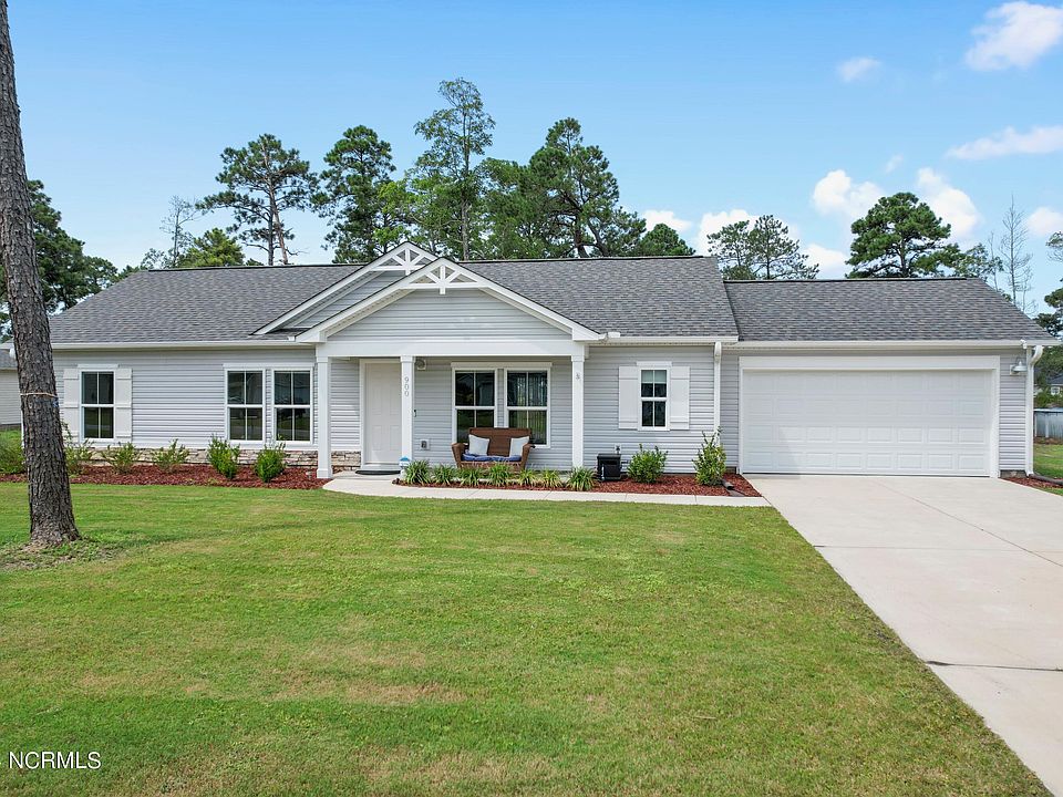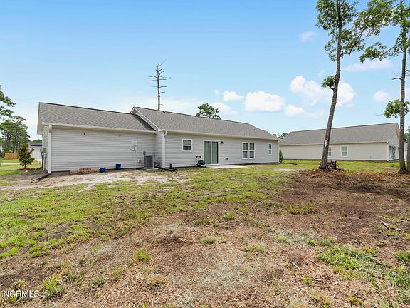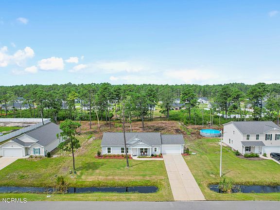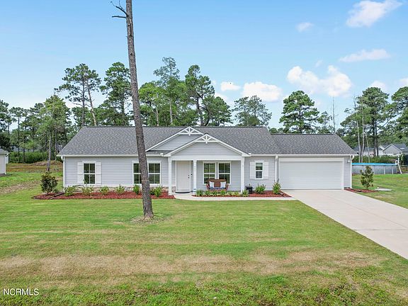 Welcome to your practically brand-new home in Boiling Spring Lakes! This charming residence offers a cozy front porch and a paved driveway, making a great first impression. Inside, you'll find a pristine interior with thoughtful upgrades, including new carpet and enhanced blinds. The owner's suite is spacious and includes a walk-in closet, while both bathrooms boast plenty of counter space and dual sinks. The open concept living and dining areas seamlessly flow into the kitchen, creating a perfect space for gatherings. The backyard, recently cleared and ready for your personal touch, features a patio for relaxing outdoors. With a 2-car garage and a generous lot, this single-level home perfectly balances comfort and practicality. Don't miss your chance to make it yours!