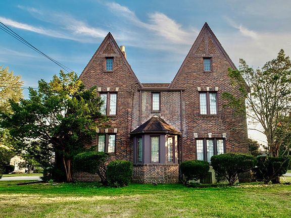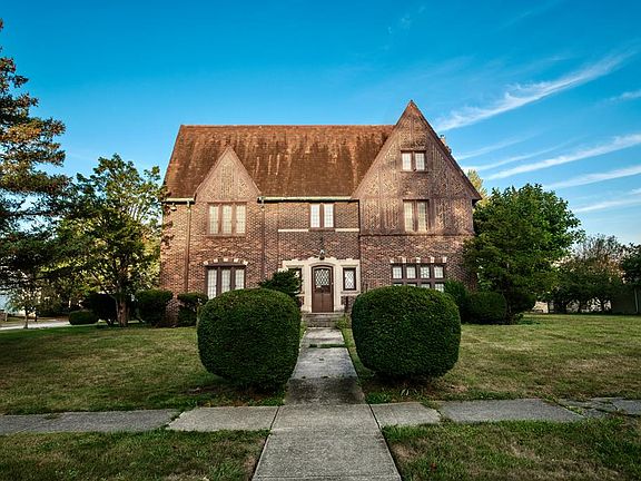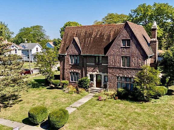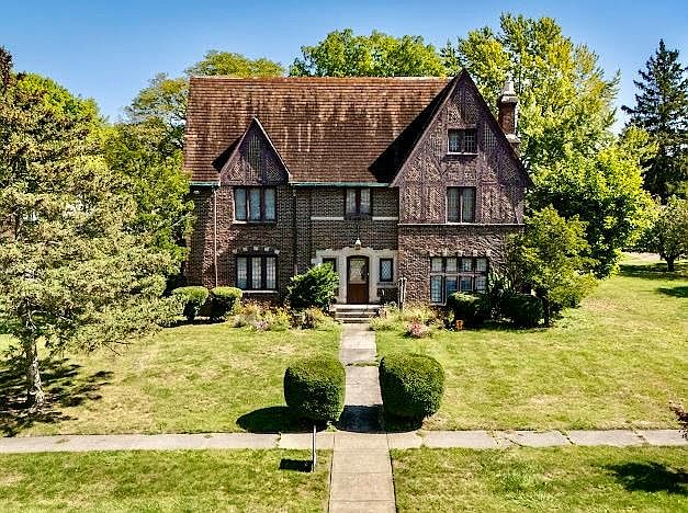 Brick Tudor home that has the wow factor the moment you walk into the entry. Includes a spiral staircase with wrought iron decorative spindles. Large formal living room with fireplace that includes a custom wood wall that centers room. Tall ceiling as well, and French doors that lead to an outside patio. Custom kitchen includes appliances, with an eat in area. Dining room has two wood built-ins. Half bath off kitchen. Wood floor under carpet on main floor. Primary bedroom includes fireplace, walk in closet with cedar, built-in drawers, and a on-suite bathroom. 3 more bedrooms and two full bath upstairs. One of the bedrooms includes custom wood walls vaulted ceiling and a hidden door. Custom wood work through out home. There are two furnaces one located in the finished attic with plenty of room for additional storage. Basement is partially finished includes family room, laundry, and a half bath. Property also includes a quest house with endless opportunity. Does need some tlc.