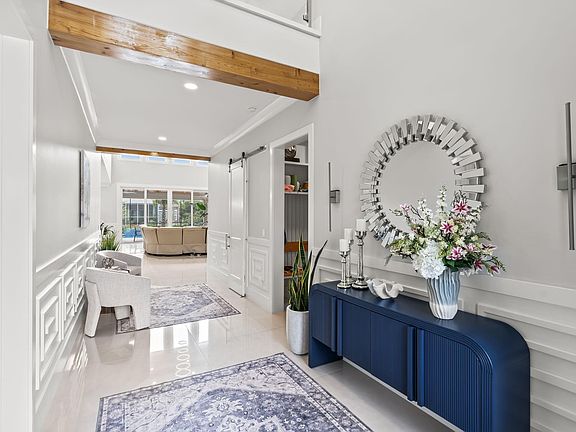 Intracoastal waterwayEpoxy-coated garageElectric fireplaceWaterfall wallSleek white stucco finishStone hardscapeProfessional tropical landscaping