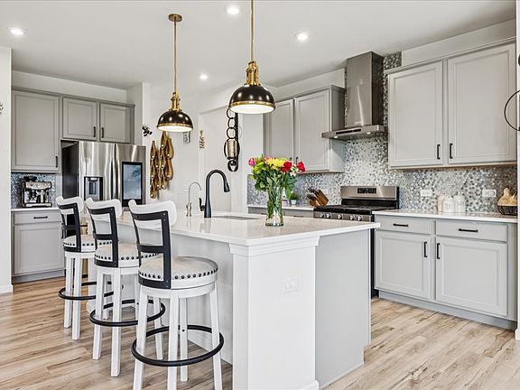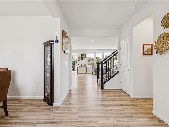 Welcome home to Trails of Woods Creek in Algonquin, located in the highly rated Huntley Community School District 158-one of the most desirable family neighborhoods in the northwest suburbs. This Hilltop model from the Estate Series offers an open concept layout with luxury vinyl plank flooring, abundant natural light, and a premium Homesite 259 location that faces north and backs to open space with a walking trail. Features include a full 9' English basement with lookout windows, chef's kitchen with 42" maple cabinets, Quartz countertops, large island with seating, pantry, and upgraded appliances including a KitchenAid dishwasher, Whirlpool 5-burner stove, drawer microwave, and Samsung refrigerator (stays). Additional upgrades: LG washer & dryer (stay), cabinets in mudroom (stay), dining room chandelier (stays), hardwired internet, upgraded recessed lighting, upgraded railings, custom closet shelving by Closets by Design, Comfort Fit sinks, upgraded glass shower doors in second bath, Hunter Douglas blinds throughout (stay), sodded front and back yard, Lenox furnace and A/C. Main floor includes a versatile flex room perfect for office, den, or bedroom, plus a convenient first-floor laundry. The owner's suite features a walk-in closet and spa-like bath with double vanity, Quartz counters, soaking tub, and separate walk-in shower. Three additional bedrooms, full bath, and loft complete the second level. Mudroom fridge, water softener, and reverse osmosis system do not stay. This move-in ready home is perfectly maintained, loaded with upgrades, and offers the ideal combination of location, style, and comfort-schedule your private showing today!
