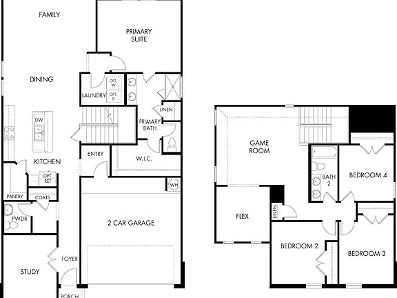 Downstairs, enjoy the Winedale's private primary suite, while the second-story flex space will make the perfect hobby or game room. Stone cabinets with ice white quartz countertops, cool grey EVP flooring with grey/brown carpet in our Distinct package.