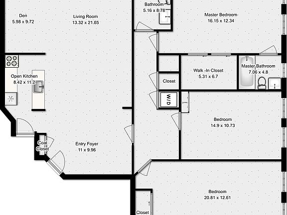 There are 3 large bedrooms with high beamed ceilings. The Master Bedroom located in the south west corner of the building, gets double exposures with great light and city views with a bathroom en-suite.