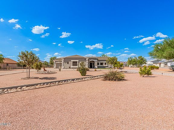 Exquisite desert oasis w/ NO HOA, NO Well/Hauled Water, NO Septic tank, MOUNTAIN VIEWS, FENCED large FLAT 1.25 acre lot. This spacious home is 2145 sqft. There a 2 bedrooms & the 3rd room is currently being used as a second family room & could be converted to a bedroom by adding a closet. The heart of the home, is the kitchen which is a chef's delight. Adorned w/ reeded glass cabinets & pendant lights, this culinary haven offers ample counter space with granite counters & tile backsplash. The large center island provides not only extra prep space but also a gathering spot. The kitchen's bright & airy atmosphere is enhanced by the bay window breakfast nook letting in plenty of natural light. Adjacent to the kitchen, the living room is thoughtfully wired for surround sound Laminate floors create a seamless flow throughout the home. The bar in the extra family room/possible 3rd bedroom does not convey. This versatile space can even be effortlessly transformed into an additional bedroom if desired. The primary bedroom is a true sanctuary, boasting his & hers closets for ample storage. The en-suite bathroom features granite counters & matching backsplash. The light and bright bathroom has a walk-in shower complete w/ a seat & separate toilet room. Natural light floods the interior, illuminating every corner of this lovely home w/ sun tunnels throughout. The second bedroom features a large french door walk-in closets & a separate door to the backyard w/ an awning & paver patio. This home also features newer low e windows. You'll be greeted by breathtaking mountain views that create a tranquil backdrop for your daily life. Additional features include a hall linen closet & wonderful laundry room w/ ample cabinets, folding space & additional desk area. The exterior of the property is equally captivating. Bask in the beauty of low-maintenance desert landscaping, adorned w/ large trees & desert plants throughout w/ an artificial turf area. The screened-in back porch w/ multiple fans offers a serene outdoor retreat. Watering system for outer yard area for the young trees & bushes. An outdoor shed provides extra storage space. This home features a 2 car oversized garage AND 2 car tandem garage w/ garage cabinets, fans, plumbed for a sink & ductwork so that it could be connected to the AC system. HVAC new in 2015. Notable extras include a water softener & water filtration system, ensuring quality water throughout the home & gutters. The home is wired for a security system but it is not currently monitored. The spa conveys with the property, promising relaxation & enjoyment. NO HOA means you have the freedom to bring all of your toys & park an RV or boat & HORSES! The large lot means you have room to make it your own! Don't miss your chance to own this remarkable gem!