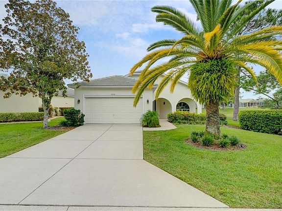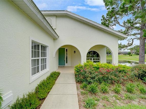 1997 Addison built maintained home on a pond with views of the golf course and no build on right. This light and airy home has 2 bedrooms+den/2 baths/2 car garage, tile roof, screened lanai, beautiful landscaping, front porch, great room floor plan, new porcelain flooring in kitchen, both baths and laundry room, updated laminate in other areas. New Samsung smooth top range and new Samsung microwave, breakfast area, closet pantry, Plantation shutters, master suite with large walk-in closet, vaulted ceilings, freshly painted interior, new 5 1/4 inch base molding, lots of new LED lights, 3 new ceiling fans, Club membership for this home is currently not mandatory, but available if desired. 1684 living sq. ft., 2595 total sq. ft.