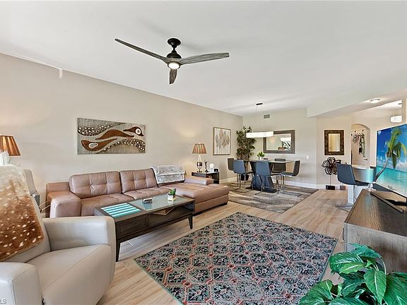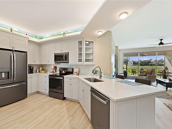 Updated Gardenia floor plan offers new flooring and beautiful new kitchen with new cabinets, appliances, counters and fixtures. The extended quartz counter opens up the kitchen area to the Great Room and also provides more space for dining or hosting. Contemporary decor and furnishing complement new features. This two-bedroom, two-bath property has a spectacular view of the 18th hole. Spring Run is a bundled golf community conveniently located near the Coconut Point Mall, Gulf Coast Town Center, FGCU, Hertz Arena, international airport and beaches. Residents may also join the Commons Club for private dining, concerts, pickleball, fitness, salon and a private beach club.