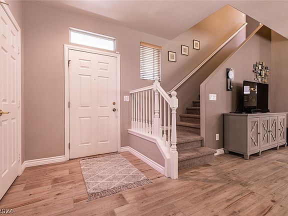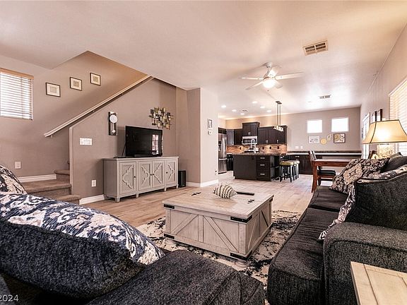 Welcome to this exceptional 2 story, 4 bedroom, 2.5 bath home located in the sought after Spring Mountain Ranch area in the NW Las Vegas. This home is immaculate and has many upgrades. Beautiful designer tile flooring thru-out the 1st floor & neutral paint. Recently remodeled Chef's kitchen features; Huge center island w/storage, pendant lighting, under cabinet lighting, SS appliances, pantry & LOTS OF ROOM TO COOK! Loft upstairs is perfect for TV, games, office or whatever you need. Bedroom 2, 3, 4 are all upstairs w/fans & closet. Spacious Primary bedroom w/ceiling fan, walk in closet & bath w/dual sinks, upgraded cabs, separate shower & tub. Laundry up w/cabinet: W/D & softener included. Pool sized lot w/gorgeous back yard & covered patio. 3 car garage w/plenty of room for parking & storage. Home is adjacent to the community park w/no house on East side. Replaced A/c & heat unit in 2018. Only minutes away from parks & splash pad, as well as Sky Canyon, grocery & more!