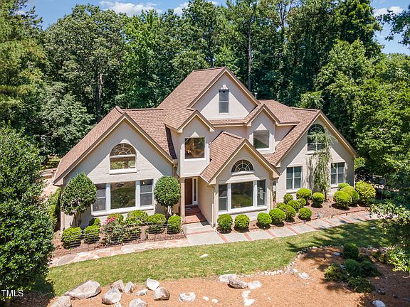 An extraordinary opportunity to own a truly exceptional estate within the prestigious, gated community of Governors Club. Perfectly positioned on one of the rarest homesites available—a level, 1.17-acre cul-de-sac lot—this home offers the ideal combination of space, privacy, and luxury living. Come inside to find a beautifully designed open floor plan, where soaring vaulted ceilings in the family room create a grand and inviting atmosphere. Natural light pours in through large windows, highlighting the refinished hardwood floors and fresh paint. The heart of the home is the newly renovated and expertly reimagined kitchen, offering stylish cabinetry, premium appliances, and elegant finishes. The kitchen flows seamlessly into both the breakfast room and the spacious family room, making it a perfect space for entertaining and everyday living. Additional main level highlights include: a private guest suite complete with a full bath and walk-in closet, a sunroom that provides a peaceful retreat for morning coffee or evening relaxation, formal dining room and newly refinished hardwood floors. Step outside and experience your own private outdoor retreat. The expansive stone patio provides a stunning backdrop for entertaining, complete with a built-in grill—ideal for hosting gatherings or enjoying quiet evenings at home. Surrounded by nature, the backyard offers a peaceful, wooded setting and backs up to a protected common area that will never be developed, ensuring long-term privacy and tranquility. Whether you're enjoying a summer cookout or a cozy fall evening under the stars, this outdoor space delivers beauty, serenity, and year-round enjoyment. Upstairs, the luxurious primary suite provides a private sanctuary, complete with ample closet space and an en-suite bath. Two additional guest bedrooms offer comfort and flexibility for family or visitors. Recently updated guest bathroom with modern finishes and fixtures. The unfinished third-floor walk-up attic offers generous storage and outstanding potential to be transformed into additional living space. Governors Club is a gated community with private country club options. Home to the Jack Nicklaus Signature 27 hole golf course, tennis courts, pools, fitness center & playground. For more information on available memberships, please contact the Governors Club Membership Director's office. More than 400 social events, clubs, tennis, swim, fitness. Tours of the clubhouse & amenities can be arranged. Close proximity to UNC, Duke, RTP, RDU Airport, top-notch shopping, sports, entertainment & medical facilities.