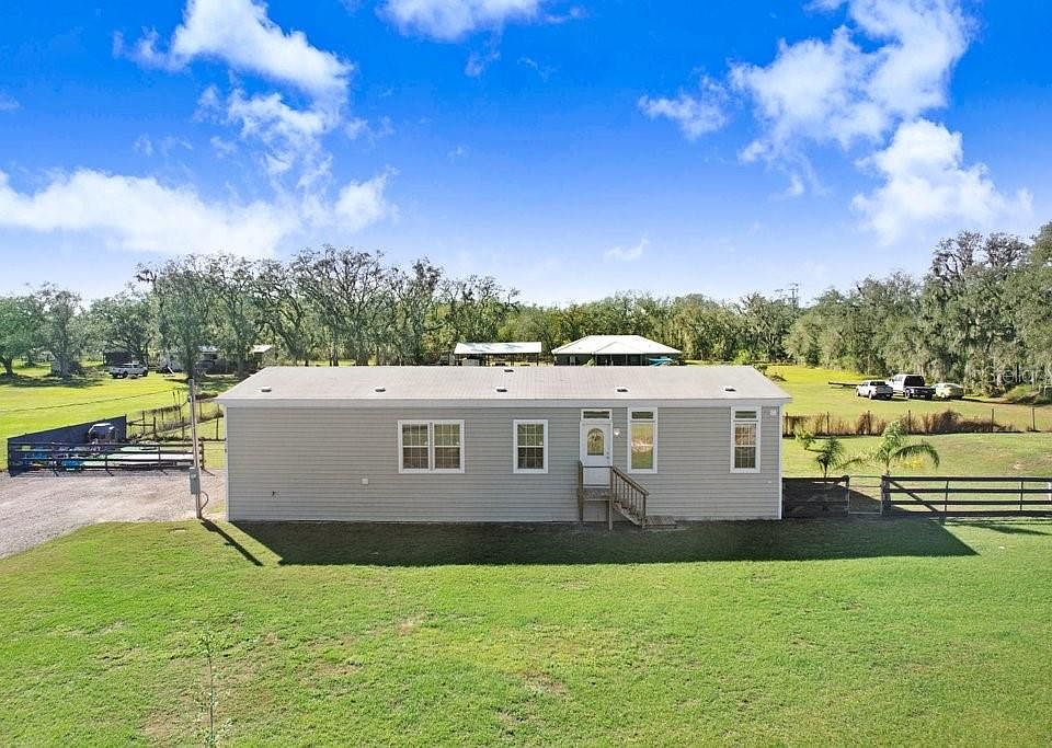 Where Hillsborough and Polk Counties meet, this stunning 1-acre homestead offers space, storage, and a beautifully designed 3-bedroom, 2-bath home—ready for its new owner. Situated on a corner lot with no easements or encroachments, this property provides both privacy and freedom. A gated drive welcomes you to a 2020 Jacobsen Homes manufactured home, built in nearby Plant City, showcasing exceptional craftsmanship and style. Step inside to discover a bright and airy great room with elegant tray ceilings and oversized windows. Above each window, transom windows add extra height and character to the space. The open floor plan seamlessly connects the living area to the kitchen and dining room, making it perfect for entertaining. The chef’s kitchen is nothing short of spectacular—worthy of a million-dollar home. A large center island offers ample storage, while a beautiful apron-front farm sink overlooks the backyard. White cabinetry provides an abundance of storage, and a hidden walk-in pantry—cleverly tucked behind the cabinetry—adds a touch of luxury and convenience. The primary suite is spacious and thoughtfully designed, featuring an oversized walk-in closet and an en-suite bathroom with natural light, extensive storage, and a shower large enough to feel like its own room. Two additional bedrooms and a guest bath complete the living spaces, while an indoor laundry room offers backyard access for added convenience. Crown molding runs throughout the home, enhancing its elegance and timeless appeal. Step outside to enjoy a wood deck leading to a backyard play area. Follow the asphalt gravel path across the property, and you'll find a well-equipped barn area with animal pens, parking spaces, and two modified shipping containers. One container is fully finished as an office space, complete with water, power, AC, and a small tankless water heater. The second serves as a workshop and storage shed, with a 400 sq/ft concrete pad in between, complete with a roof. A dedicated 100-amp breaker box powers the entire barn area, and water access is readily available. There's still plenty of room to grow on this property—whether it's revitalizing the pond area, creating a small pasture, or cultivating fresh produce in the garden boxes. Best of all? No HOA. That means the freedom to truly make this property your own. Come experience what it means to "Live Free in Florida!"